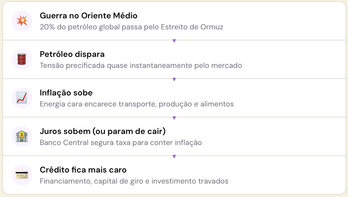 Vem comigo que a cadeia é mais simples do que parece. O Irã bloqueou o Estreito de Hormuz — a rota por onde passa 20% de todo o petróleo mundial. Oferta cai, demanda não muda. Preço sobe. Energia fica mais cara, frete fica mais caro, fertilizante fica mais caro. Inflação pressiona. Banco Central segura os juros altos por mais tempo. O corte da Selic em março? Virou dúvida.