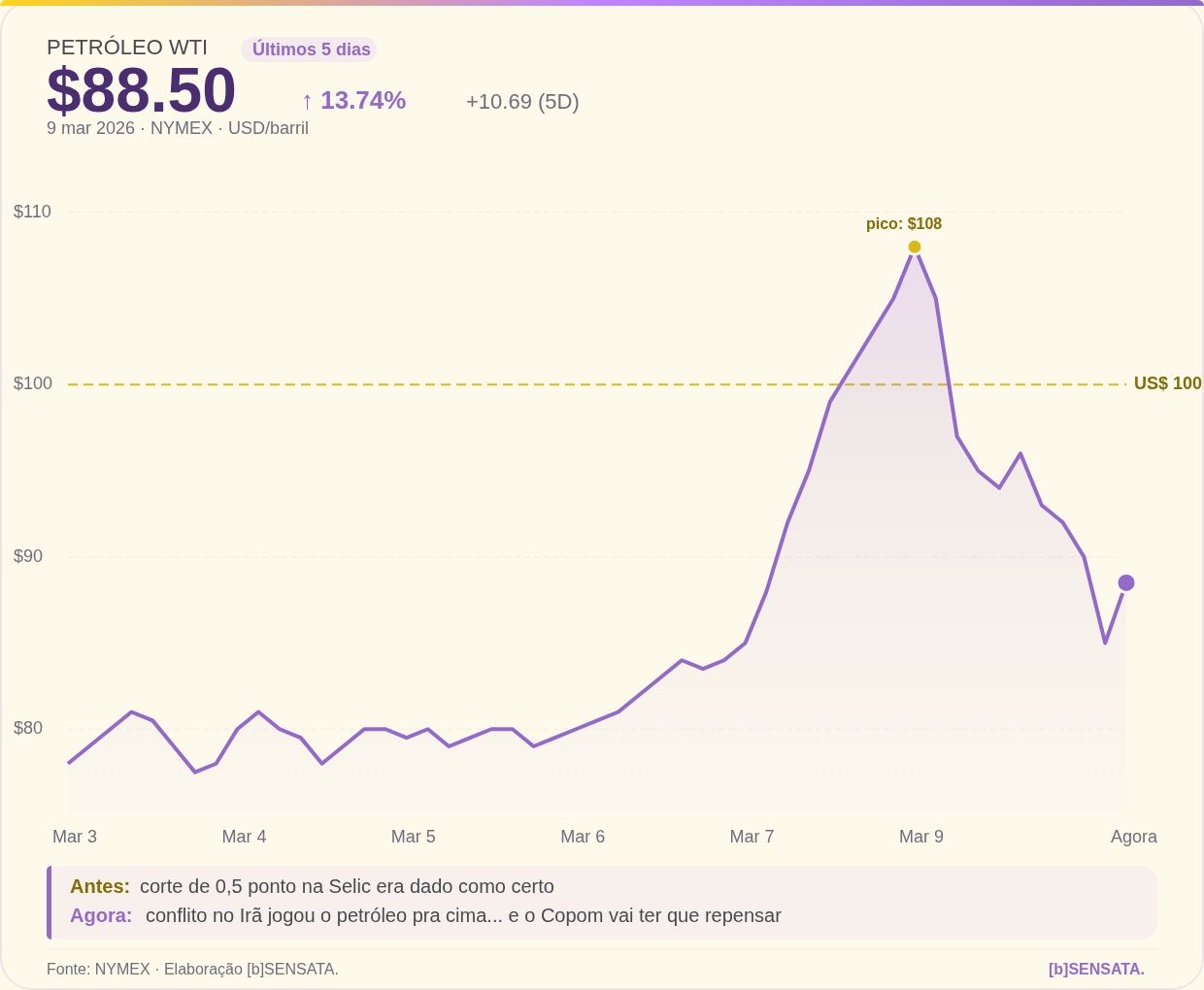 Por que isso importa? Petróleo caro = tudo mais caro (combustível, frete, comida, fertilizante). E se tudo fica mais caro... inflação sobe. E se inflação sobe... o Banco Central não pode cortar juros como planejava. (tem uma aula no Guia da Economia Sensata que explica isso rapidinho)